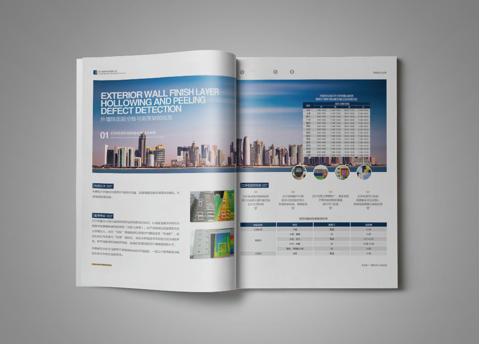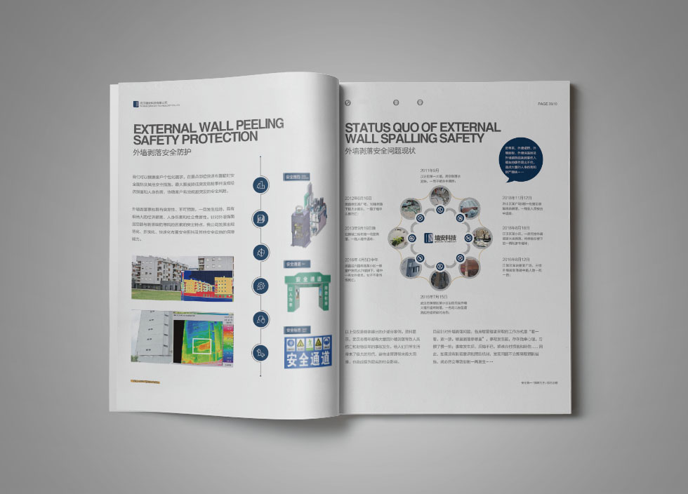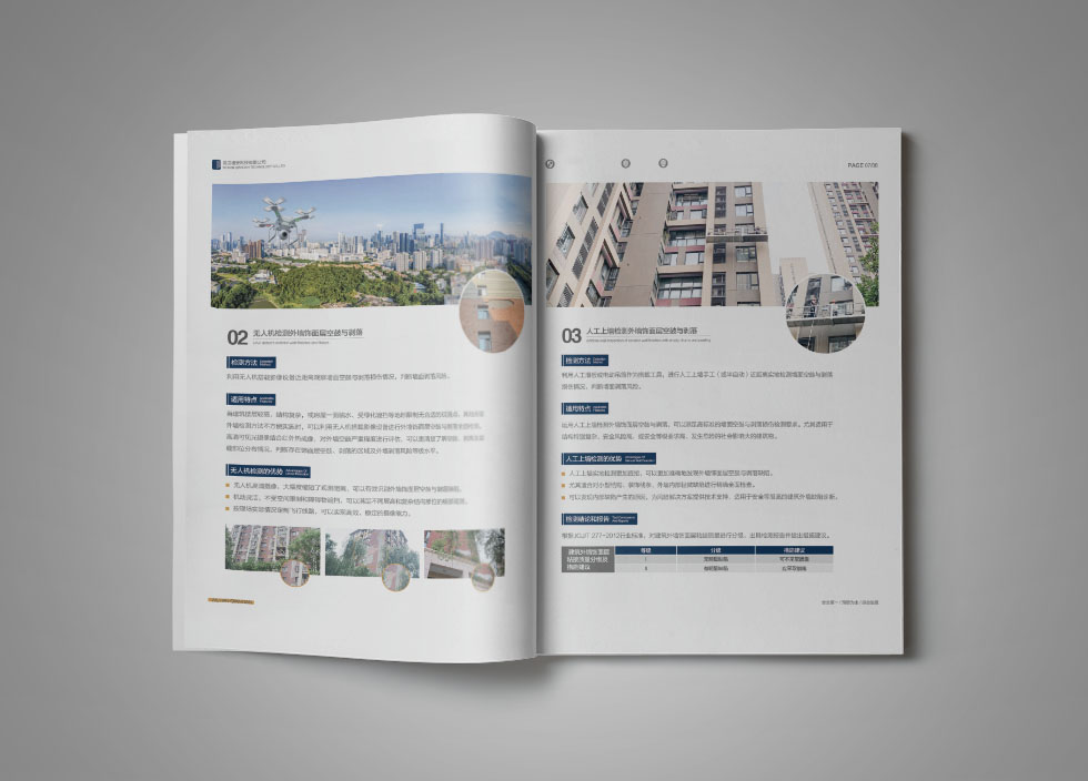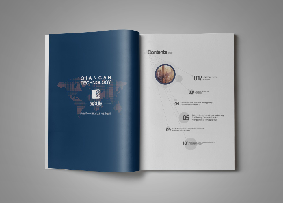 項(xiàng)目背景:武漢墻安科技有限公司是一家專業(yè)的房屋安全治理與維保服務(wù)商,以房屋外墻安全檢測與風(fēng)險(xiǎn)預(yù)控為核心業(yè)務(wù),提供專業(yè)的外墻空鼓、剝離、脫落檢測,以及風(fēng)險(xiǎn)評(píng)估、風(fēng)險(xiǎn)控制、方案設(shè)計(jì)等服務(wù),為各類住宅、辦公寫字樓、工業(yè)廠房等房屋提供全壽命周期內(nèi)的持續(xù)性、全方位安全保障。艾的爾承接其畫冊設(shè)計(jì)制作,成立品牌設(shè)計(jì)小組,與企業(yè)進(jìn)行深入溝通,明確企業(yè)對(duì)于畫冊設(shè)計(jì)的需求,通過對(duì)企業(yè)行業(yè)屬性和主要服務(wù)的深入了解和研究,在畫冊設(shè)計(jì)、創(chuàng)意的過程中,封面大膽留白,將重點(diǎn)突出“房屋外墻剝落安全治理專家”。