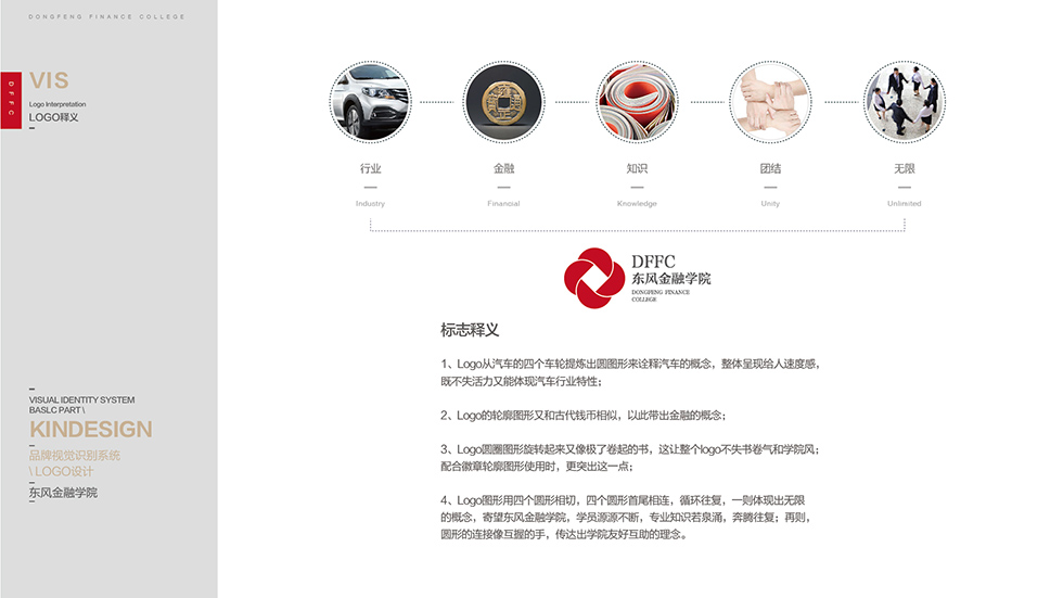 項目背景:東風(fēng)汽車財務(wù)有限公司(東風(fēng)金融)成立于1987年,是經(jīng)中國人民銀行批準(zhǔn)設(shè)立的全國第一家企業(yè)集團(tuán)財務(wù)公司。注冊資本金90億元人民幣,由東風(fēng)汽車集團(tuán)股份有限公司全資控股經(jīng)營。東風(fēng)金融學(xué)院面向東風(fēng)公司員工、合作經(jīng)銷商、供應(yīng)商、集團(tuán)成員單位,致力于成為“企業(yè)文化使者、員工成長顧問、業(yè)務(wù)發(fā)展伙伴、開放合作搭檔”。艾的爾設(shè)計承接其品牌VI設(shè)計,主動與東風(fēng)金融學(xué)院對接,成立品牌VI設(shè)計小組7人:品牌總監(jiān)1名、設(shè)計總監(jiān)1名、資深設(shè)計師4名、文案策劃1名,了解品牌的本質(zhì)需求、商業(yè)目的、目標(biāo)消費(fèi)群體審美偏好、行業(yè)與品類特性及品牌文化。通過金融、知識、團(tuán)結(jié)、無限這四要素來開展設(shè)計制作。Logo設(shè)計從是個車輪提煉出圓圖形來詮釋汽車概念,呈現(xiàn)速度感、活力,是個圓角相切,體現(xiàn)出無限的的概念,學(xué)院源源不斷,學(xué)院友好互助,整體顏色采用紅色傳承活力。