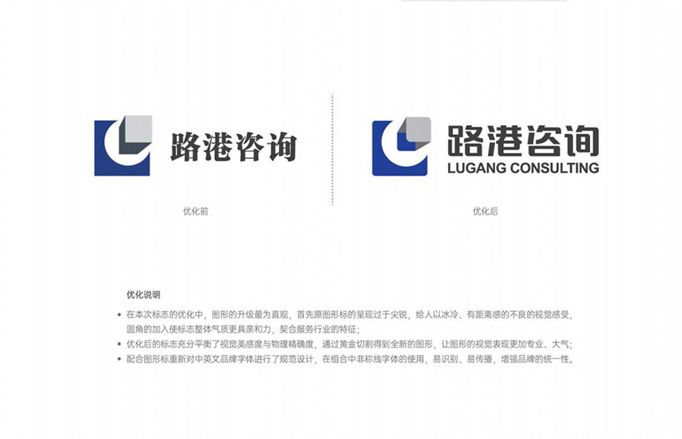 項(xiàng)目背景:湖北路港工程咨詢有限公司成立于2001年,是湖北省建設(shè)工程造價(jià)咨詢協(xié)會(huì)第四屆理事會(huì)副理事長(zhǎng)單位,公司具有中華人民共和國(guó)住房和城鄉(xiāng)建設(shè)部頒發(fā)的工程造價(jià)咨詢甲級(jí)資質(zhì)等多項(xiàng)資質(zhì)。艾的爾設(shè)計(jì)承接其品牌VI設(shè)計(jì),與客戶深入溝通后,明確企業(yè)寓意對(duì)LOGO設(shè)計(jì)進(jìn)行優(yōu)化,在此標(biāo)志優(yōu)化中圖形的升級(jí)最為直觀,原圖形標(biāo)的呈現(xiàn)過(guò)于尖銳,給人冰冷的視覺(jué)感受,優(yōu)化后的標(biāo)志整體氣質(zhì)具有親和力,契合服務(wù)行業(yè)的特征,也通過(guò)黃金切割得到全新的圖形,視覺(jué)表現(xiàn)更加專業(yè)、大氣。