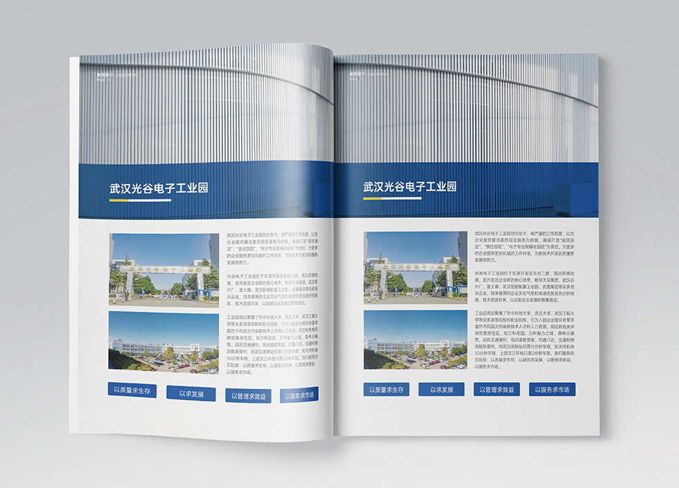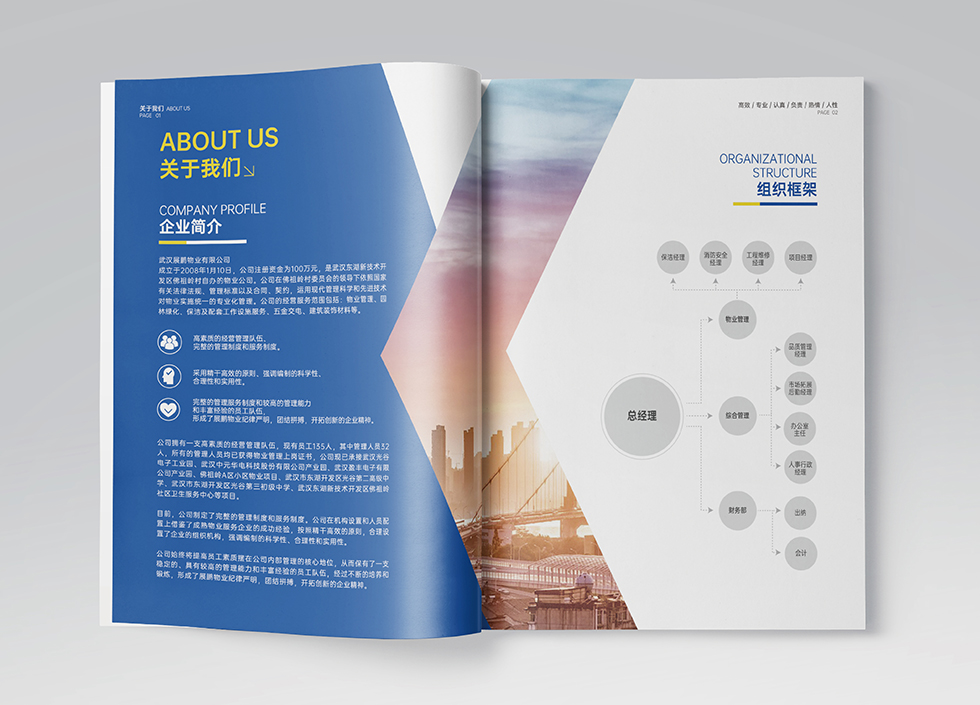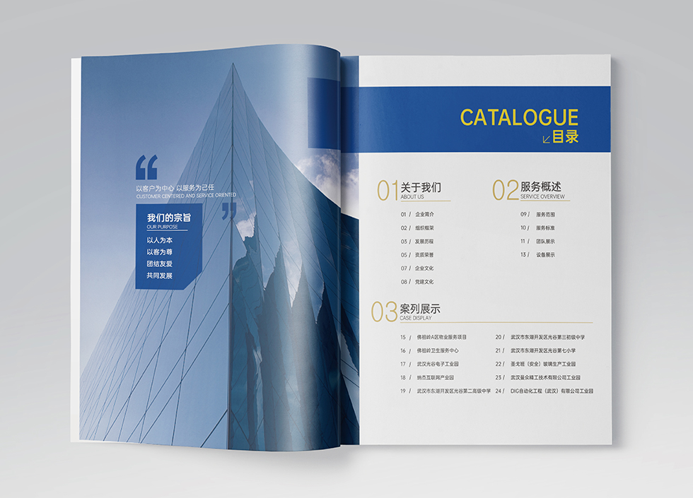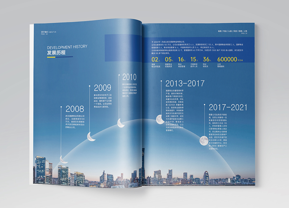 項(xiàng)目背景:武漢展鵬物業(yè)是一家運(yùn)用現(xiàn)代管理科學(xué)和先進(jìn)技術(shù)對(duì)物業(yè)實(shí)施統(tǒng)一的專(zhuān)業(yè)化管理的公司,艾的爾設(shè)計(jì)接受其委托,承接畫(huà)冊(cè)設(shè)計(jì)項(xiàng)目。在畫(huà)冊(cè)設(shè)計(jì)、創(chuàng)意的過(guò)程中,設(shè)計(jì)師通過(guò)對(duì)行業(yè)屬性進(jìn)行深入地了解,根據(jù)企業(yè)屬性,進(jìn)行了畫(huà)冊(cè)設(shè)計(jì)、創(chuàng)意。在畫(huà)冊(cè)設(shè)計(jì)中,設(shè)計(jì)師突出專(zhuān)業(yè)、科學(xué)與高效的同時(shí)體現(xiàn)服務(wù)業(yè)的行業(yè)屬性,因此大面積的藍(lán)與點(diǎn)綴的黃成為畫(huà)冊(cè)主體顏色,封面以武漢的黃鶴樓為主展現(xiàn)展鵬物業(yè)在武漢服務(wù)與廣大業(yè)主與客戶(hù)的服務(wù)業(yè)屬性。整體強(qiáng)化每一板塊的名稱(chēng),突出板塊的重點(diǎn),區(qū)域區(qū)分簡(jiǎn)潔明了,能讀者快速了解公司
