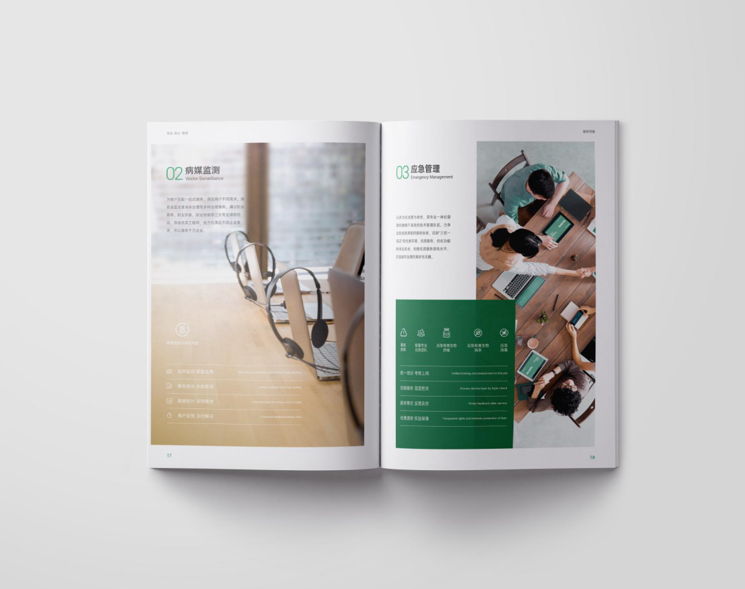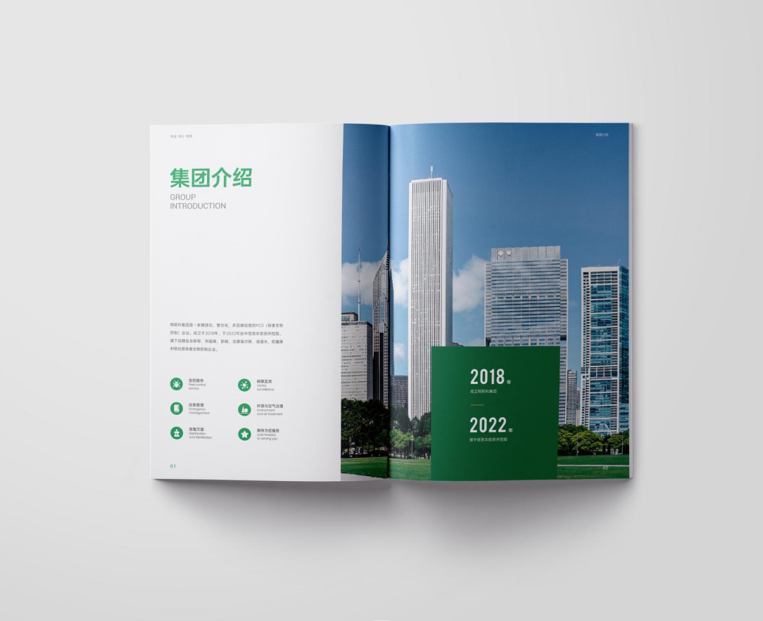 項(xiàng)目背景:TSK特斯科集團(tuán)是一家集團(tuán)化、整合化、多品牌經(jīng)營(yíng)的PCO(有害生物防制)企業(yè)。致力于在蟲(chóng)控服務(wù)、應(yīng)急管理、環(huán)境與空氣治理、消毒殺菌等方面為客戶提供貼心可靠的服務(wù)與安心高效的保障。服務(wù)內(nèi)容涵蓋從技術(shù)檢查和日常預(yù)防性檢查,到蟲(chóng)害預(yù)防、控制凈滅工作、清除害蟲(chóng)污染物、專(zhuān)業(yè)消毒等全過(guò)程。此外還針對(duì)不同行業(yè)的客戶需求,協(xié)助管理供應(yīng)鏈,提供包括人員培訓(xùn)、蟲(chóng)害風(fēng)險(xiǎn)咨詢、鑒定報(bào)告、通過(guò)內(nèi)外部審計(jì)等高附加值服務(wù)。艾的爾設(shè)計(jì)通過(guò)與企業(yè)進(jìn)行深入溝通,明確企業(yè)對(duì)于畫(huà)冊(cè)設(shè)計(jì)的需求,畫(huà)冊(cè)封面內(nèi)容簡(jiǎn)潔并突出重點(diǎn),綠色的采用,與品牌vi調(diào)性一致,符合行業(yè)屬性,在內(nèi)頁(yè)的設(shè)計(jì)中,按黃金分割比例設(shè)計(jì),標(biāo)題與文字的板塊相互呼應(yīng),圖文分布疏密有致,整個(gè)版面簡(jiǎn)潔優(yōu)雅。畫(huà)冊(cè)內(nèi)頁(yè)的顏色選用上,和封面相互呼應(yīng),以綠白等清新雅致的顏色為主。整個(gè)畫(huà)冊(cè),設(shè)計(jì)精簡(jiǎn)、嚴(yán)格,充分展現(xiàn)出了企業(yè)的訴求和形象。